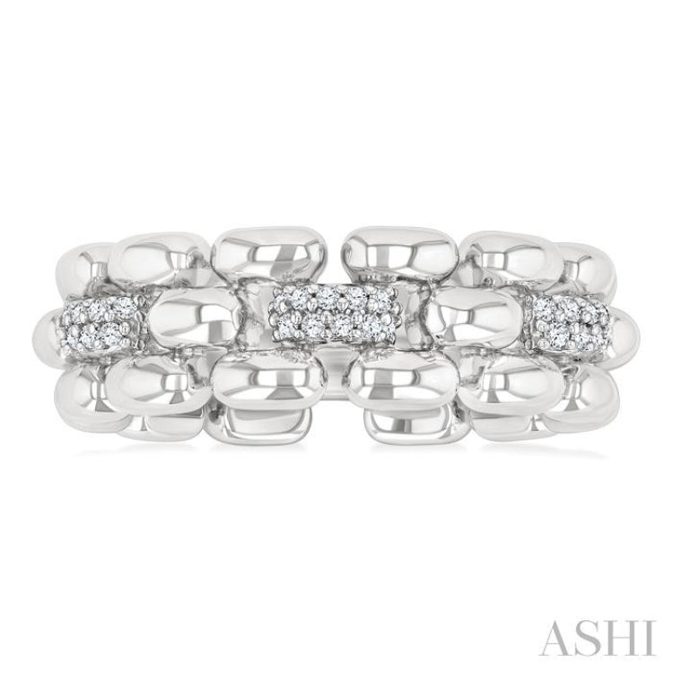 Sleek, structured, and unapologetically bold, this diamond fashion ring draws inspiration from iconic watch-strap panther links. The ring features a full-circle design of interlocked 3-link segments, with plain silver links forming the outer edges. Down the center, the middle links alternate between plain and diamond-adorned links. At the top of the ring, three prominent center links are each encrusted with a twin row of pave hand set round cut diamonds, 10 diamonds per link, adding to a total of 30 diamonds. Carved in rhodium finish silver, the diamond fashion ring balances strength and sparkle with effortless modernity. Total diamond weight is 1/10 ctw.
